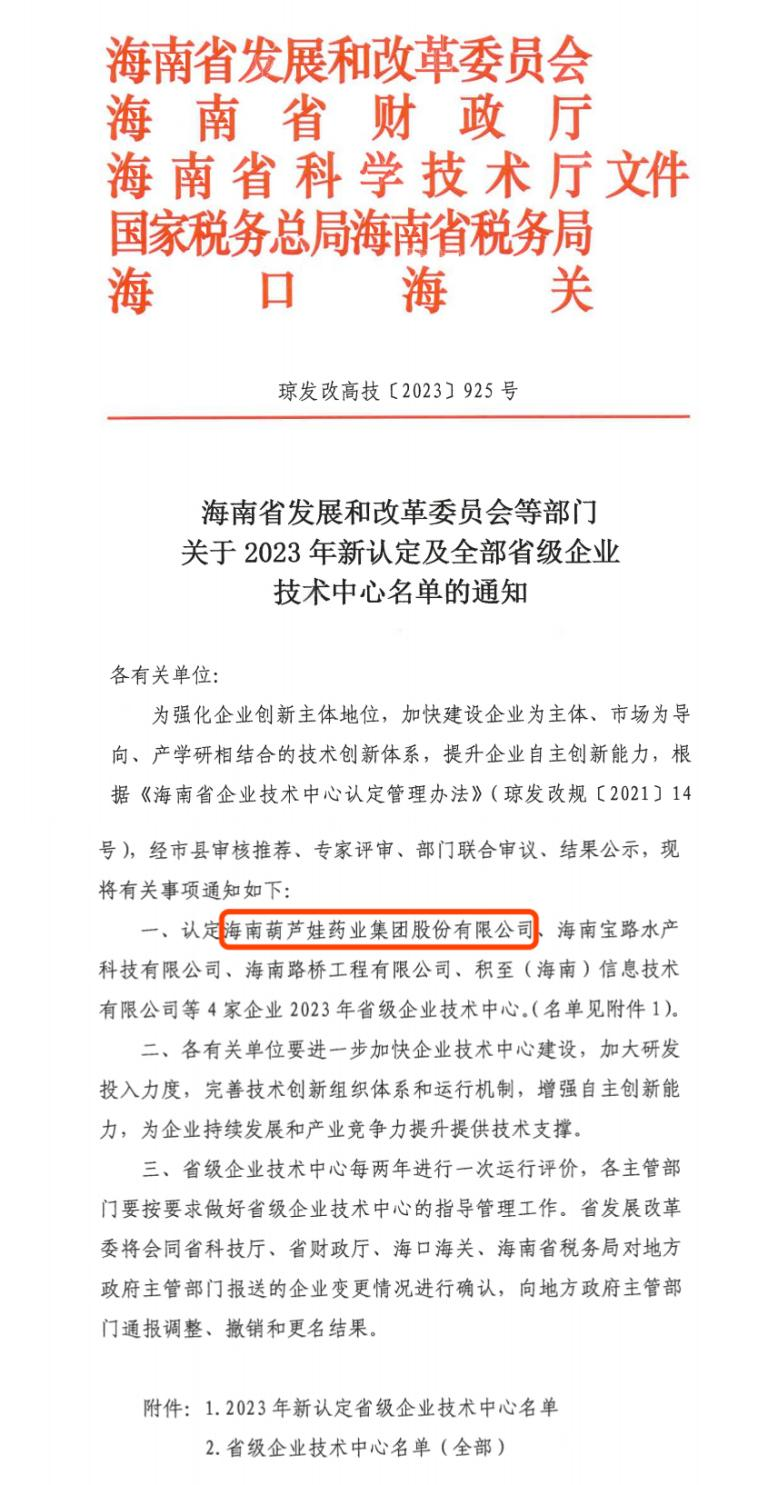 近日,海南省发改委等多部门联合公布了《关于2023年新认定及全部省级企业技术中心名单的通知》,其中,海南AG贵宾药业集团股份有限公司成功通过评审,被认定为省级企业技术中心,是本次获批的4家企业之一。